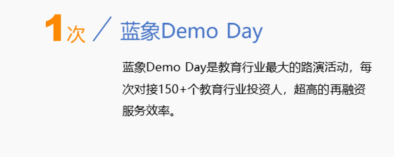 藍象資本是專注教育領域的早期基金,項目按照1000萬元估值投資30或80萬元。每年2期“藍象營”加速計劃,每期持續6個月。